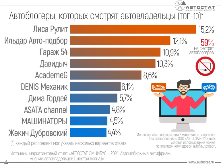 Респонденты отвечали на вопрос: «Каких автомобильных блогеров вы смотрите?». Выяснилось, что более 60% автовладельцев вообще не интересуются подобным видеоконтентом. Но среди тех, кто смотрит такого рода видео, отдали предпочтение:
