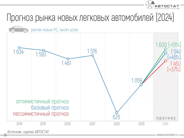 Эксперты агентства «АВТОСТАТ» озвучили прогноз по продажам новых легковых автомобилей в России в 2024 году: