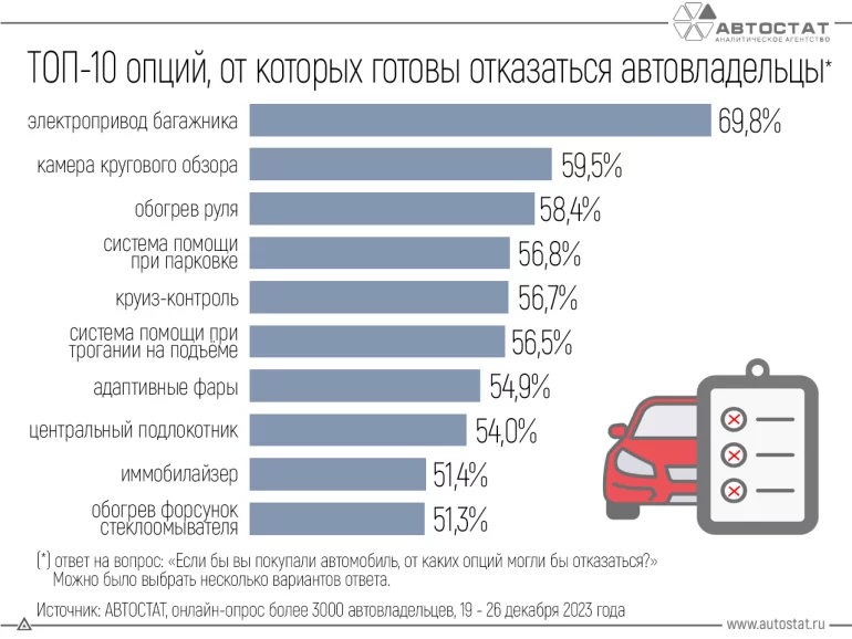 Всем им задавался один и тот же вопрос: «Если бы вы покупали автомобиль, от каких опций могли бы отказаться?». При этом выбрать можно было сразу несколько вариантов ответа.