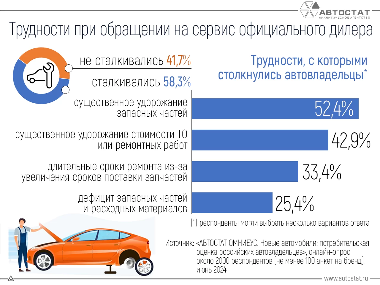Эксперты агентства «АВТОСТАТ» выяснили, с какими трудностями сталкиваются автовладельцы, обращаясь на сервис дилера. В июне 2024 года был проведен онлайн-опрос, в котором приняли участие около 2 тысяч респондентов.