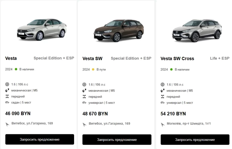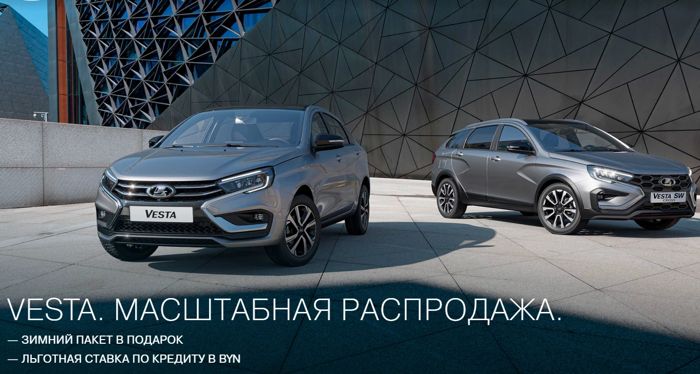 Сайт Лада.Онлайн решил сравнить цены на официальном сайте импортера LADA в Республике Беларусь и в РФ. Седан Lada Vesta в соседней стране можно купить за 46 090 BYN (1 365 918 рублей), в России рекомендованная розничная цена на такой автомобиль начинается с отметки 1 525 000 рублей. Универсал стоит чуть дороже 48 670 BYN (1 442 379 рублей), а у нас минимальная цена на Vesta SW — 1 655 000 рублей. Седан кросс в Республику Беларусь не импортируется, а вот универсал Кросс предлагаются по 54 210 BYN (1 606 562 рублей), что снова дешевле, чем в РФ (1 879 000 рублей).