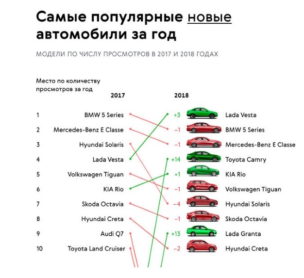 В ТОП-10 самых популярных новых автомобилей попали Lada Vesta (1 место) и Lada Granta (9 место). Популярность главного конкурента Hyundai Solaris продолжает падать. В десятку самых популярных подержанных машин попали Lada Priora (7 место) и Lada Samara (10 место).