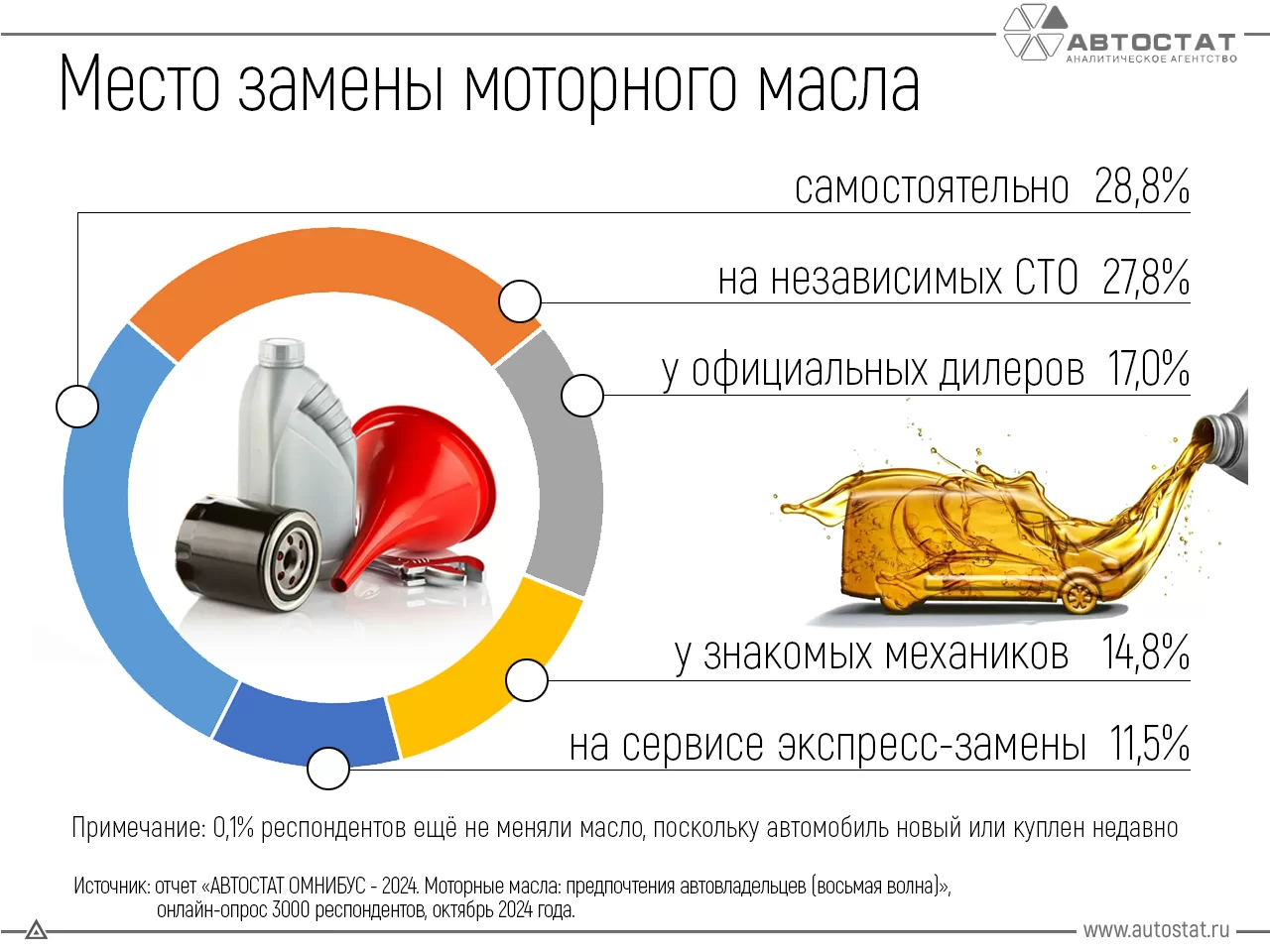 Эксперты «АВТОСТАТ» решили выяснить, где в России автовладельцы производят замену масла в двигателе. С этой целью в октябре 2024 года был проведен онлайн-опрос, в котором приняли участие 3 000 человек.