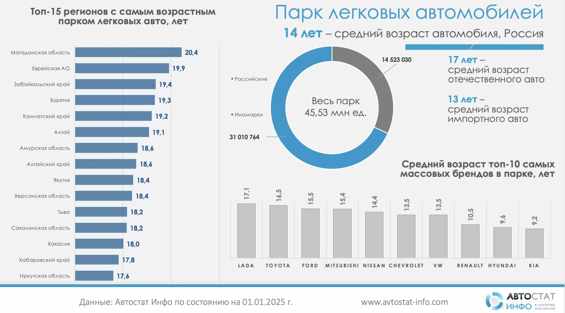 Согласно данным «Автостат Инфо», на начало 2025 года средний возраст легковых машин в России составляет 14 лет. Возраст иномарок в среднем 13 лет, а российских авто — 17 лет.