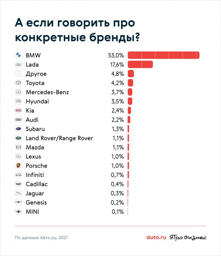 В опросе 2021 года среди марок 53 процента участников опроса назвали самыми «напористыми» водителей автомобилей BMW — это почти 90 процентов от всех немецких марок. Или в 9 раз больше, чем набрали марки Audi и Mercedes-Benz вместе.
