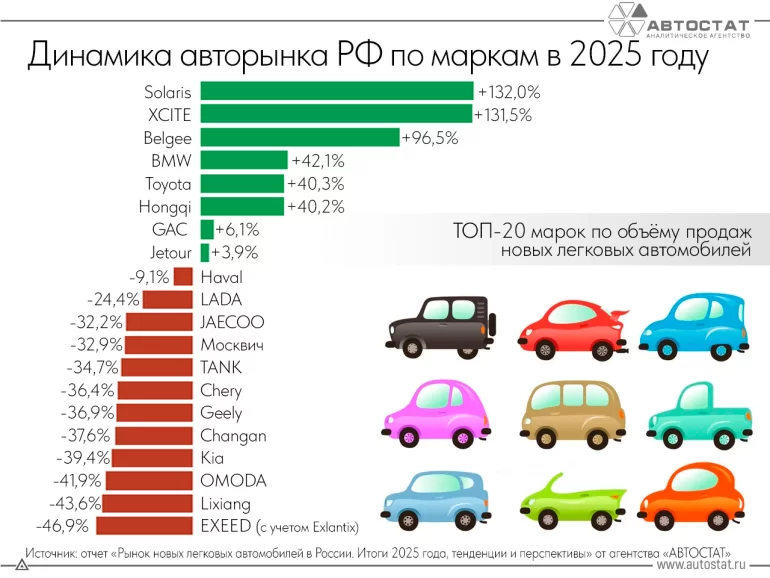 По итогам 2025 года на Ладу приходится 24,88% от общего объема продаж. Между тем годом ранее ее доля находилась на уровне порядка 28%. Самым популярным иностранным брендом по итогам минувшего года остался Haval.