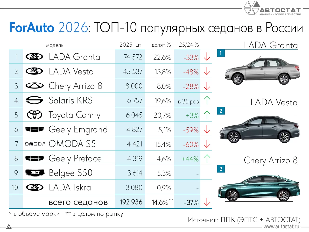 Эксперты агентства «АВТОСТАТ» составили рейтинг самых продаваемых седанов в РФ по итогам 2025 года. Возглавляет его по-прежнему LADA.