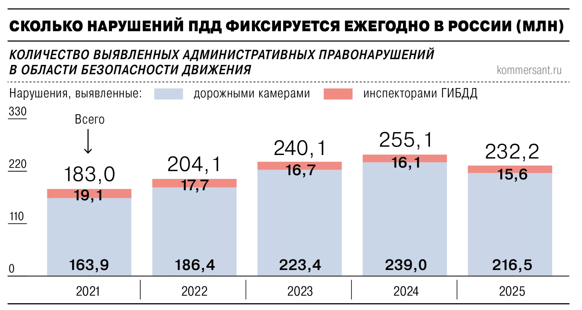 В 2025 году количество нарушений ПДД снизилось на 9% (до 232 млн случаев) по сравнению с 2024 годом. Такие данные публикует МВД, пишет Коммерсантъ. Эксперты связывают снижение с повышением штрафов с 1 января 2025 года и отключением/сокращением работы камер в ряде регионов.