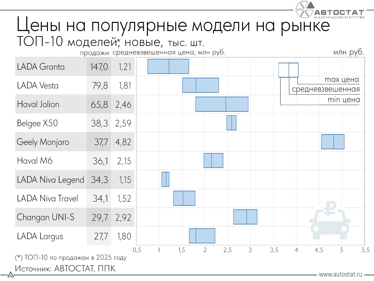 Эксперты агентства «АВТОСТАТ» выяснили, что разброс цен на самые продаваемые новые легковые автомобили в РФ в 2025 году составлял от 0,75 млн до 5,05 млн рублей. Средневзвешенная цена этих моделей превышает 1 млн рублей. В рейтинг попали модели LADA.
