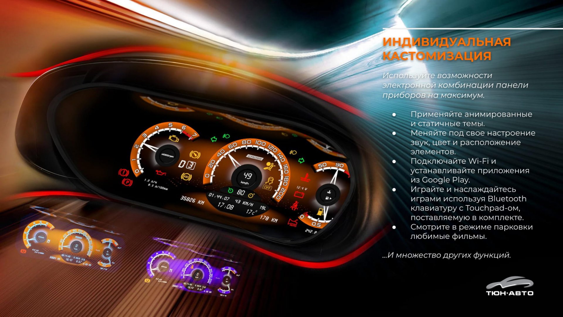Комбинация приборов подключается к штатному разъёму. При установке придется немного доработать крепление в торпедо (все необходимое для этого есть в комплекте). Для удобной настройки щитка предусмотрено специальное мобильное приложение. Интернет подключается через WiFi или USB-модем. Есть возможность менять скины (оформление интерфейса). Включение цифровой панели моментальное, разработчик сделал задержку выключения 12 часов (моментальная, если перерыв между запусками не более 12 часов).