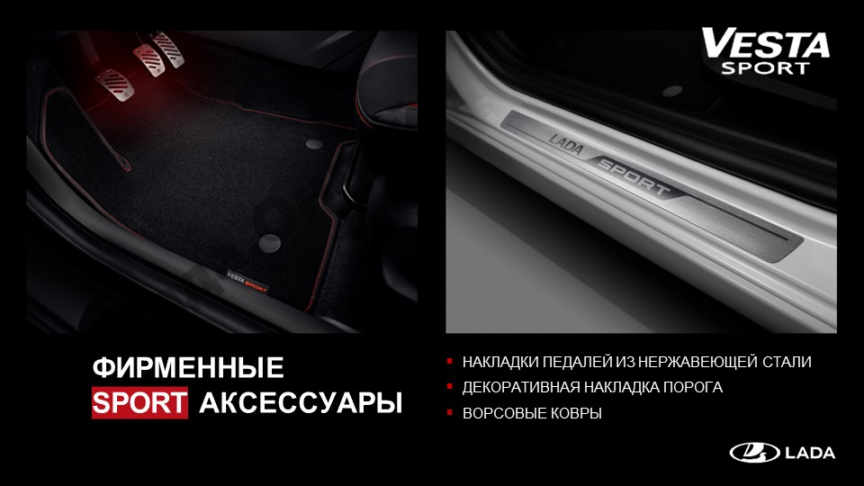 Дополнить стиль помогут фирменные SPORT аксессуары: накладки педалей из нержавеющей стали, декоративные накладки порогов и ворсовые коврики.