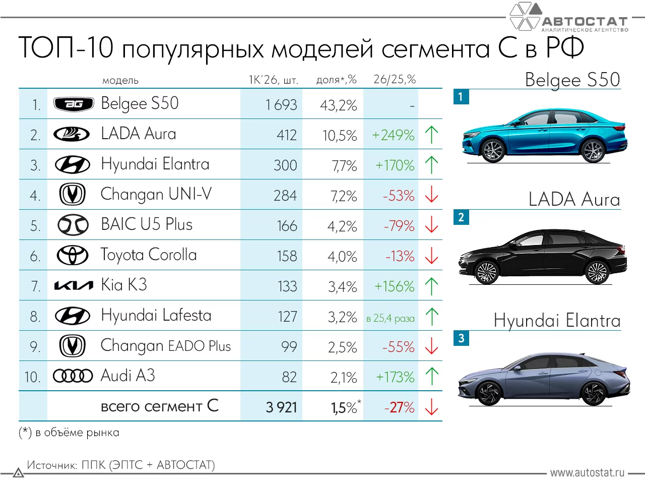По данным агентства АВТОСТАТ в 1 квартале 2026 года в России было продано около 4 000 новых автомобилей сегмента C. Половина из 10 моделей сегмента C доступны только по параллельному импорту (Hyundai Elantra и Lafesta, Toyota Corolla, Audi A3, Kia K3). Остальные пять моделей официально представлены в России. Lada Aura заняла вторую строчку рейтинга.