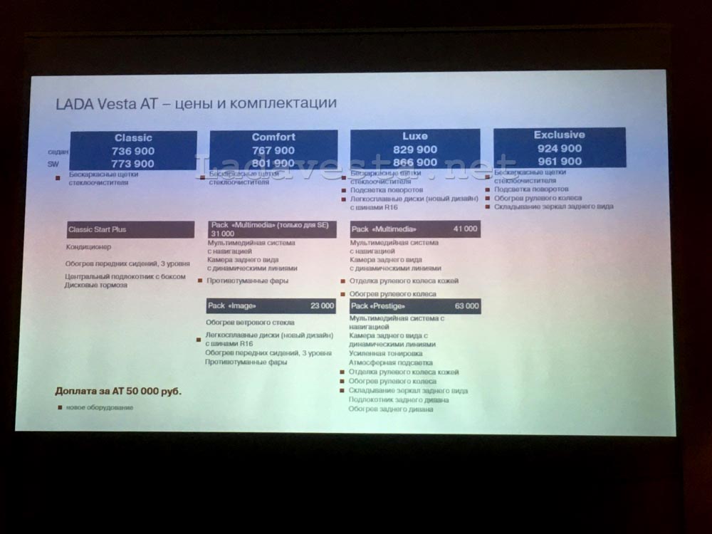 Доплата за новый двигатель и трансмиссию составляет 50 тысяч рублей (см. цены на Весту с вариатором). Вариатор получили все модели, кроме Lada Vesta Sport. С появлением вариатора, продажи Lada Vesta с АМТ прекращены.