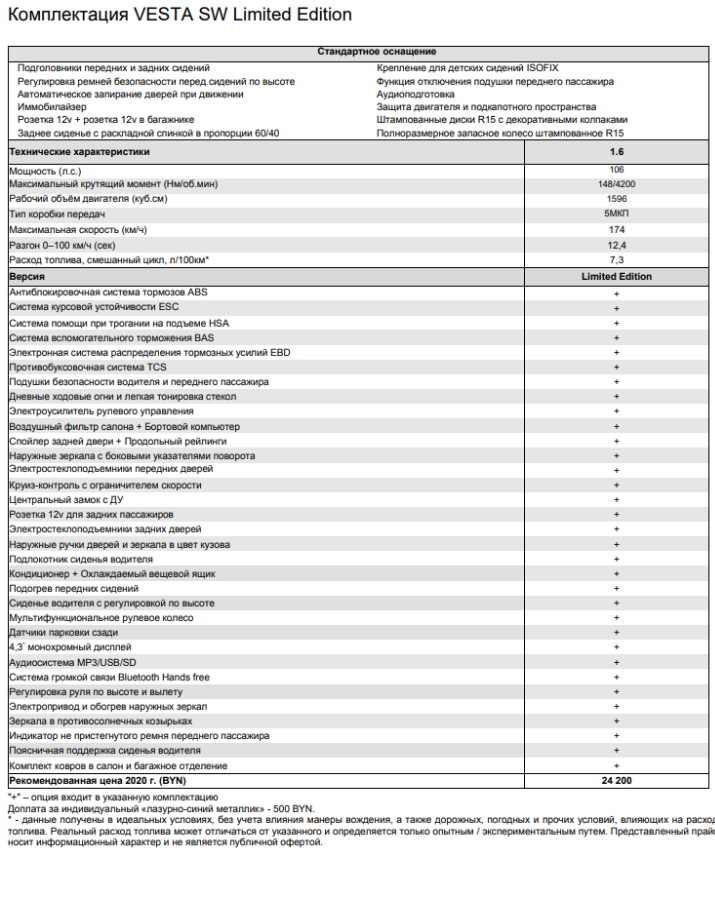 Lada Vesta SW Limited Edition в Беларуси – полностью соответствует комплектации Comfort для России, ничего отличного от рынка РФ там нет.
