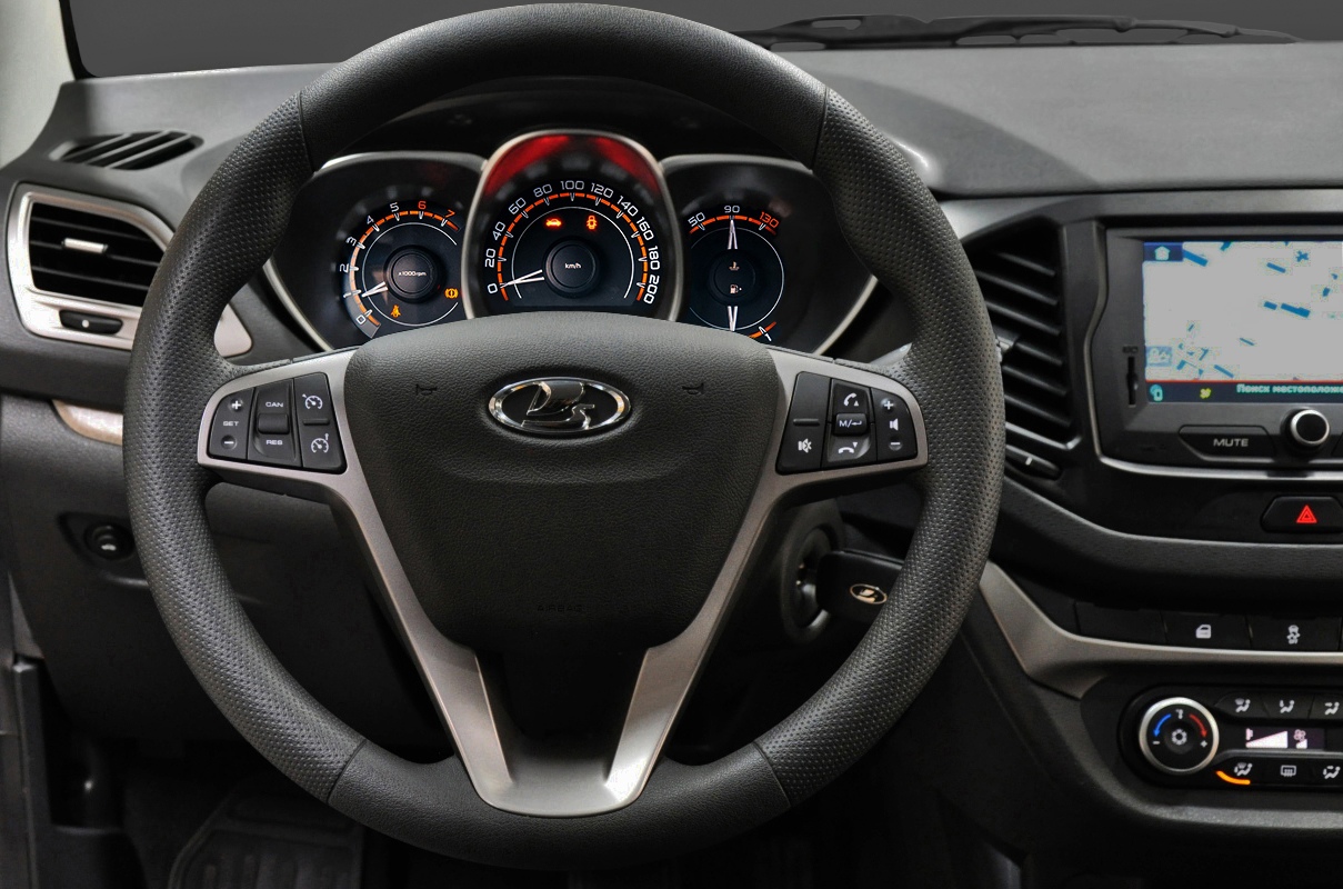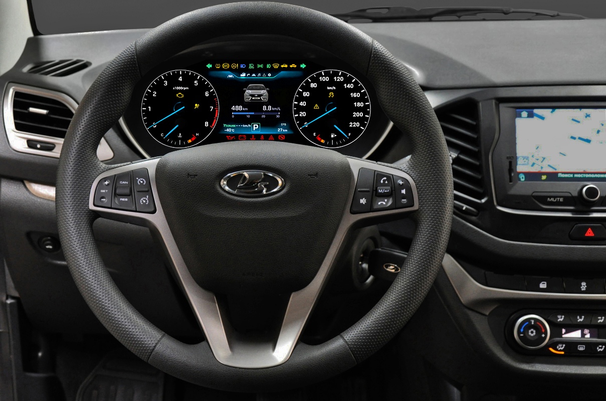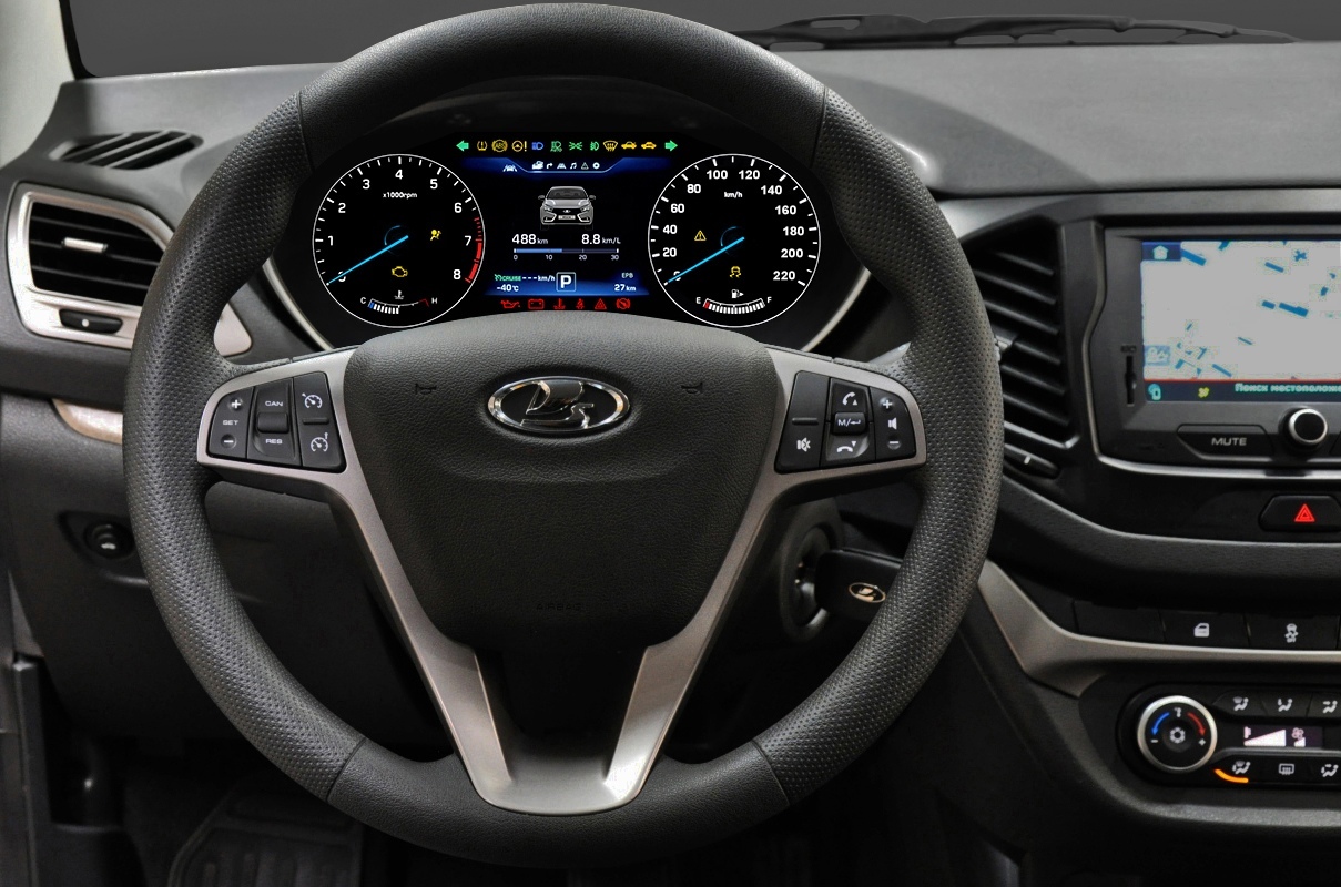 Цифровая панель Весты была нарисована с помощью фотошопа. Тахометр слева, спидометр справа, а по центру большой мультимедийный дисплей. Одно из преимуществ цифровой панели - возможность менять оформление. Поэтому автор фото предложил сразу несколько цветовых решений: