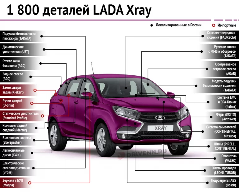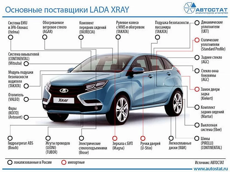 Одна из главных задач АВТОВАЗа - повышение уровня локализации автомобилей LADA (доли комплектующих местного производства). При этом нет задачи стопроцентной локализации выпускаемой продукции, локализация должна быть по ключевым компонентам, блокам, узлам и агрегатам автомобиля. Сайт Лада.Онлайн собрал всю информацию об уровне локализации семейства Lada XRAY.