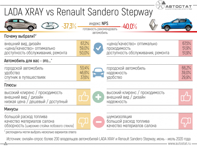 Как показывает исследование, при всех своих достоинствах LADA XRAY получил у респондентов низкий NPS (готовность рекомендовать автомобиль друзьям и знакомым): -37%. Наряду с преимуществами (высокий клиренс, внешний вид, низкая цена), в ходе опроса автовладельцы указали целый ряд недостатков автомобиля. Так, почти каждый третий участник исследования (31%) отметил большой расход топлива у данного хэтчбека. Практически каждый девятый указал на дешевый пластик в отделке салона и плохую обзорность из-за широких стоек лобового стекла.