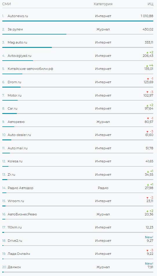 В рейтинг вошли медиаресурсы автомобильной отрасли. По итогам 2021 года сайт Лада.Онлайн занял 19 строчку рейтинга, расположившись рядом с Drive2.ru и Движок. Лидерами рейтинга стали Autonews.ru, За рулем и Mag.auto.ru.