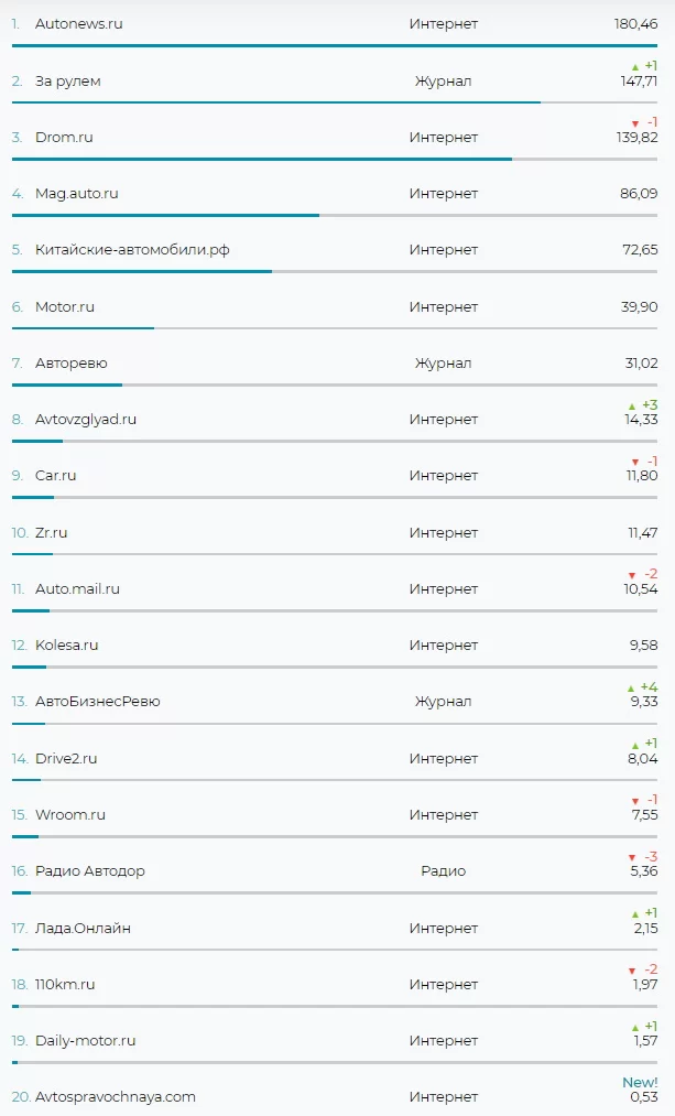 В рейтинг вошли медиаресурсы автомобильной отрасли. Сайт Лада.Онлайн занял 17 строчку рейтинга, расположившись рядом с ресурсами Радио.Автодор и 110km.ru. Лидерами рейтинга стали Autonews.ru, За рулем и drom.ru.