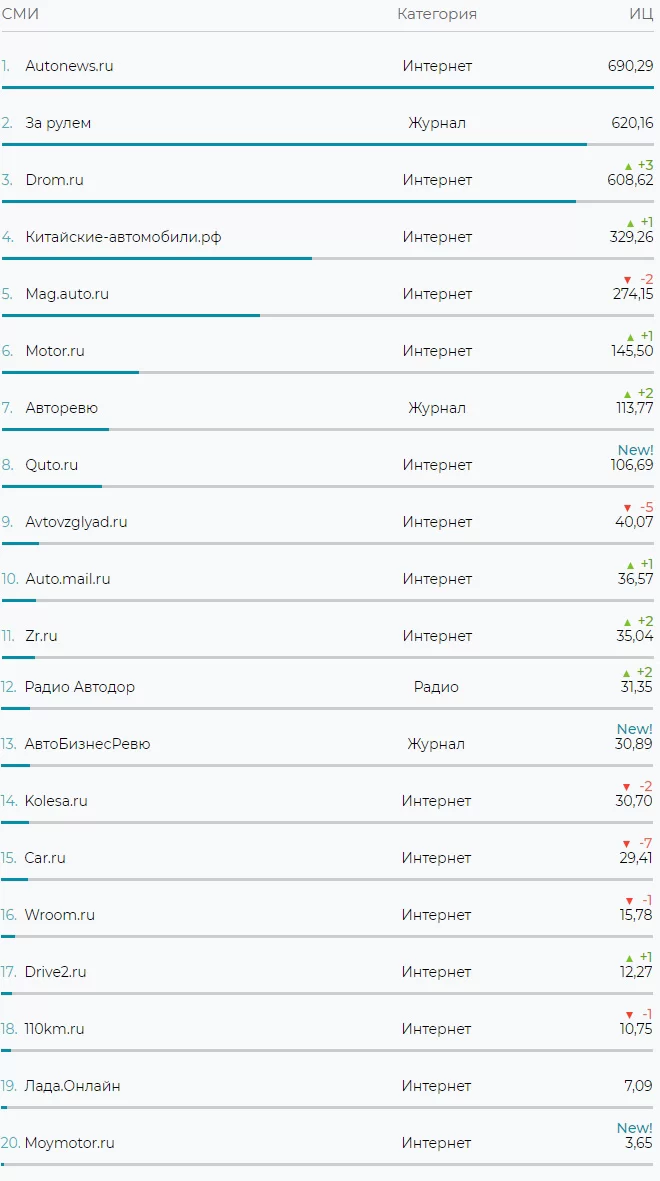 В рейтинг вошли медиаресурсы автомобильной отрасли. Сайт Лада.Онлайн занял 19 строчку рейтинга, расположившись рядом с ресурсами Радио.Автодор и Moymotor.ru. Лидеры рейтинга – интернет-ресурс Autonews.ru, а также журнал За рулем и интернет-ресурс Drom.ru.