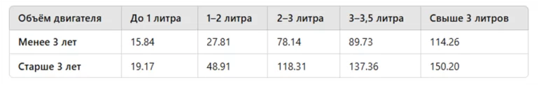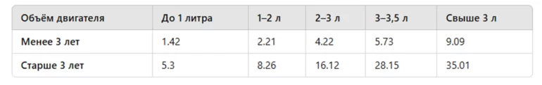 Ставка зависит от объёма двигателя и возраста автомобиля: