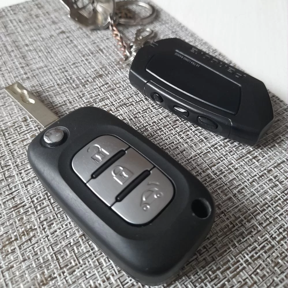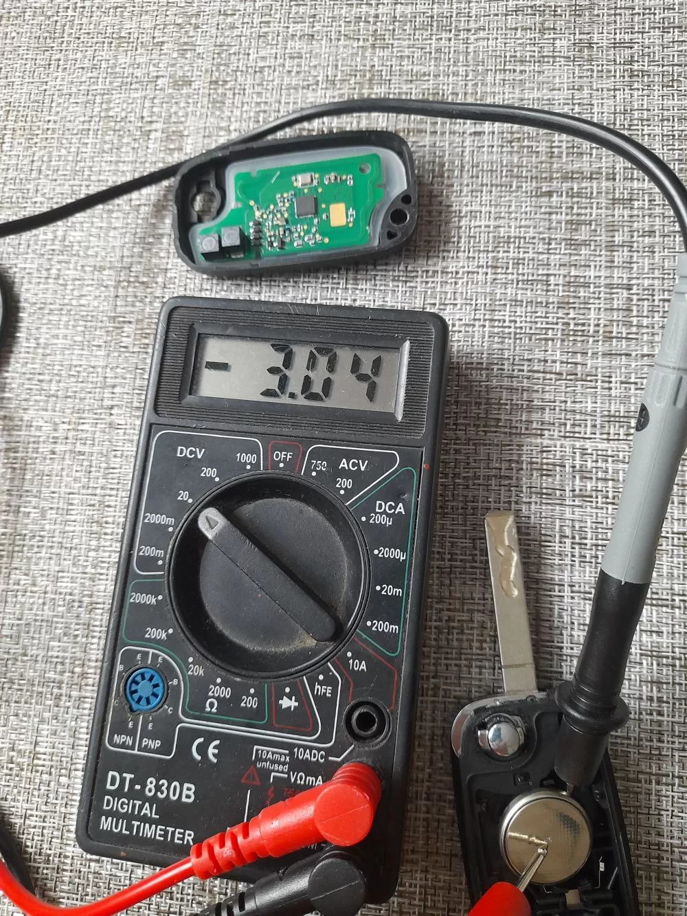 Дома сначала попробовал открывать-закрывать центральный замок (сигнализацию) с помощью запасного штатного ключа (брелка), машина реагировала — всё как положено (открывалась и закрывалась). Короче, я к хренам, разобрал оба эти свои штатные брелки (ну или брелоки, я х.з. как правильно))) и мультиметром замерил напряжение батареек.