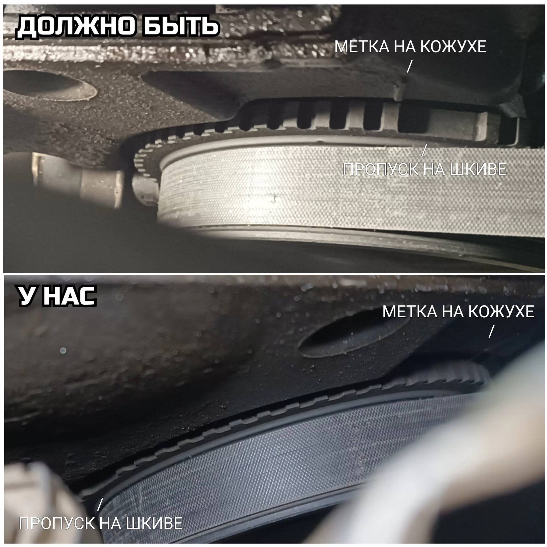И посмотрим на шкив коленвала. Вот оно. Коленвал отстаёт от распредвалов почти на половину оборота.