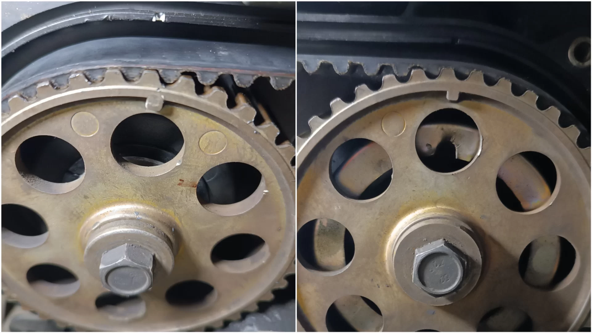 Распредвалы уехали на 6 зубов. Клапаны открываются и закрываются рано, компрессия пропадает, форсунки относительно открытия клапанов брызгают поздно (из-за неработающего датчика распредвала впрыск считается по коленвалу) и двигатель не запускается. Меняем ремень (большой пробег), ролики (один сломан и оба шумят) и датчик распредвала (не работает) на новые, правильно выставляем метки и запускаем двигатель.