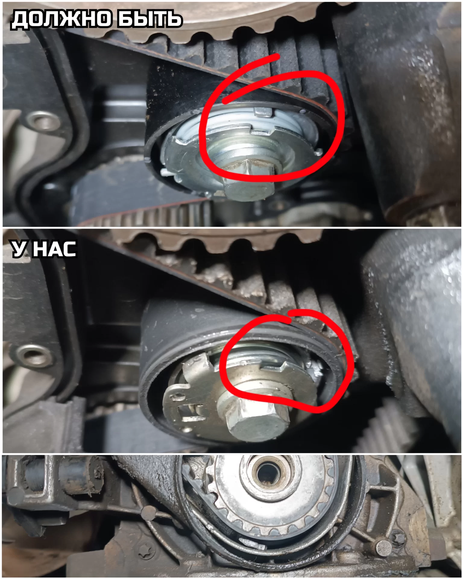 Сняв кожух ГРМ и посмотрев на натяжной ролик, я увидел, что он сломан.