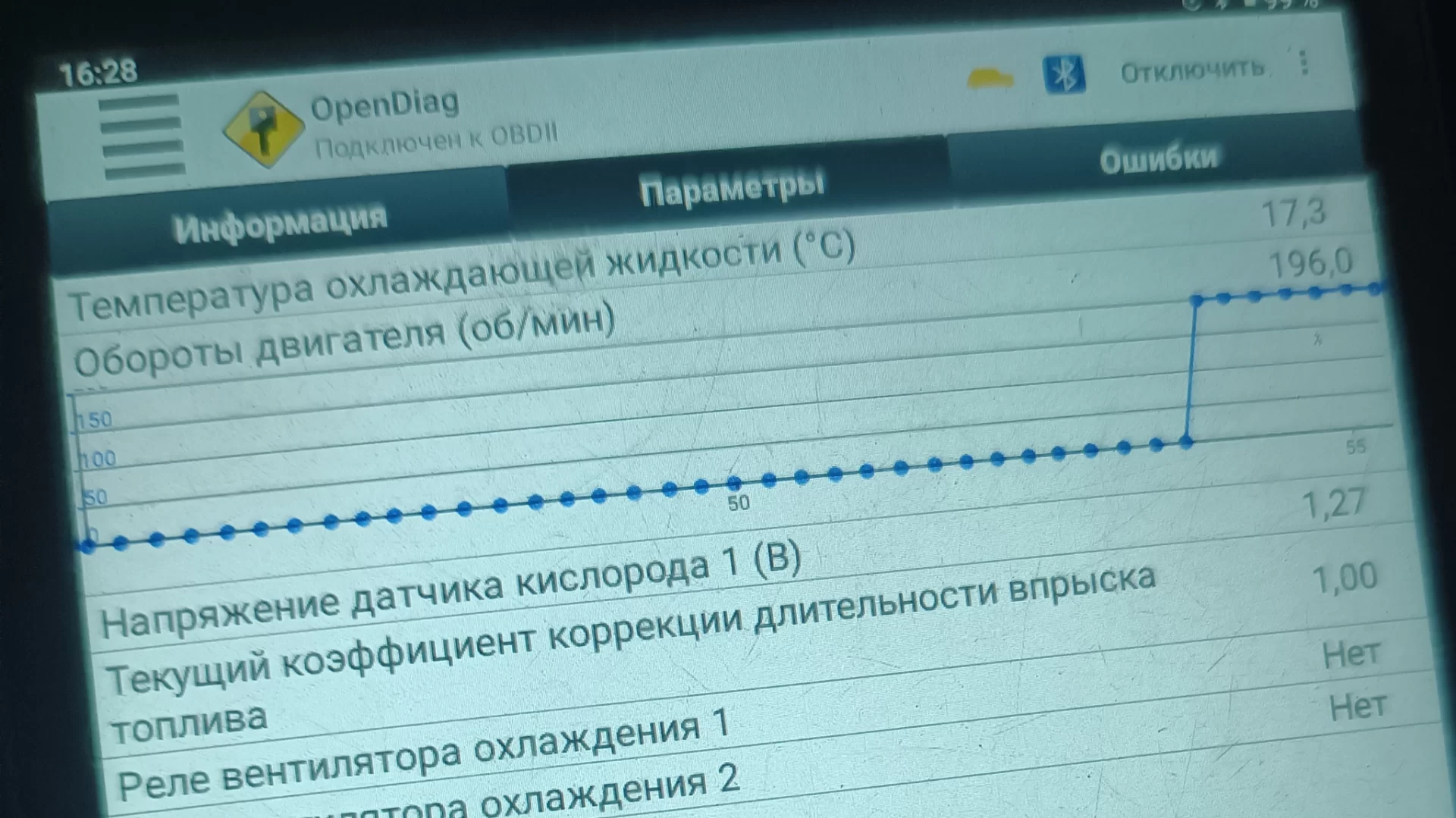 Проверим, видит ли ЭБУ обороты коленвала — видит.