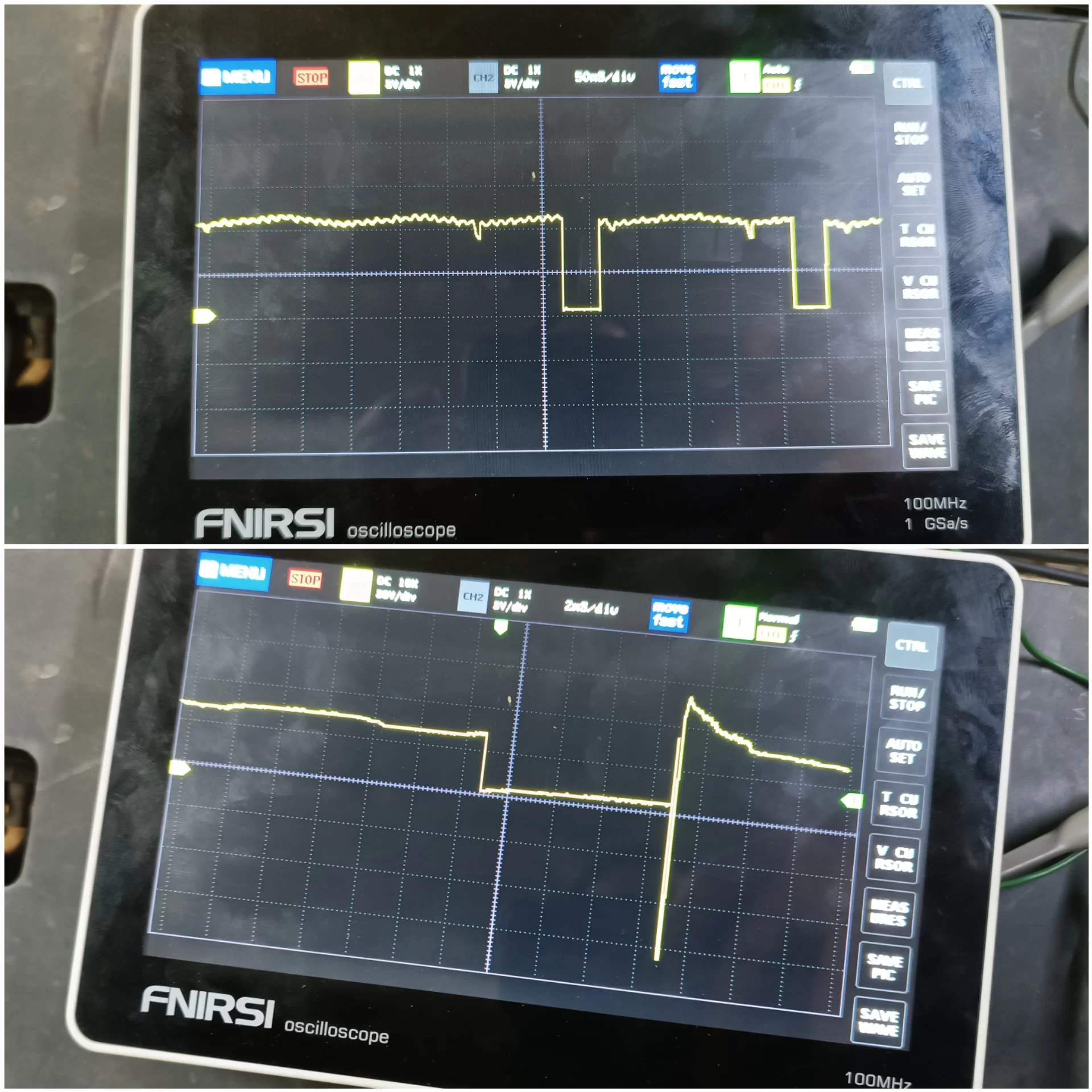 На осциллограмме ДПКВ — ДПРВ видно, что показания ДПКВ в норме, а сигнал ДПРВ всегда равен опорному напряжению и не меняется. Учитывая, что распредвал крутится, в чём мы убедились заглянув в маслозаливную горловину, делаем вывод что неисправен датчик или задающий диск.