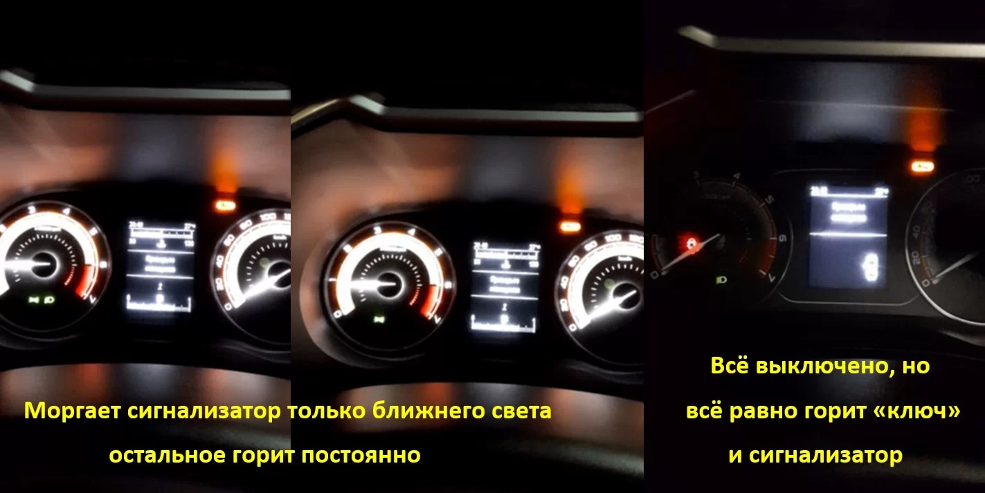 Теперь более редкая проблема, но тоже глюк — по "ближнему свету". Уже пару раз было (в июне и в августе), что во время движения на небольшой скорости (и кажется при входе в поворот) в темное время суток (включен ближний свет, без дальнего) на панели приборов начинал моргать сигнализатор неисправности ближнего света и загорелся сигнализатор "Ключ". Высвечивалась надпись на приборке — проверить освещение. Я проверял, со светом полный порядок и спереди и сзади. Возможно, это загоралось при нажатии на педаль тормоза (при входе в поворот) или наоборот при отпускании педали тормоза. И всё это было ещё до замены датчика педали тормоза, хотя возможно с "лягушкой" это никак и не связано🤔. Но дальше буду наблюдать… И даже при постановке на сигналку всё равно сигнализаторы продолжали светится, утром пришёл открыл — полный порядок, как ничего и не было…