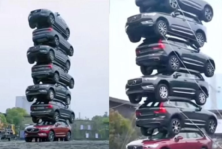 Китайская Chery решила показать прочность алюминиевого кузова своего электромобиля eQ7. Для этого компания соорудила башню из этих машин. Получается, что самый нижний автомобиль выдерживает вес шести машин, а также дополнительных площадок, которые установлены между машинами.