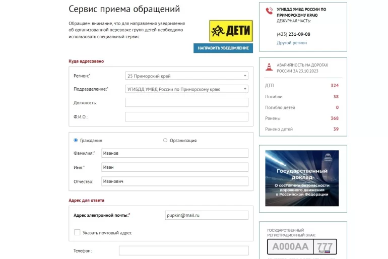 Заполняем все поля со звездочками. Регион соответственно правонарушения. Подразделение любое.