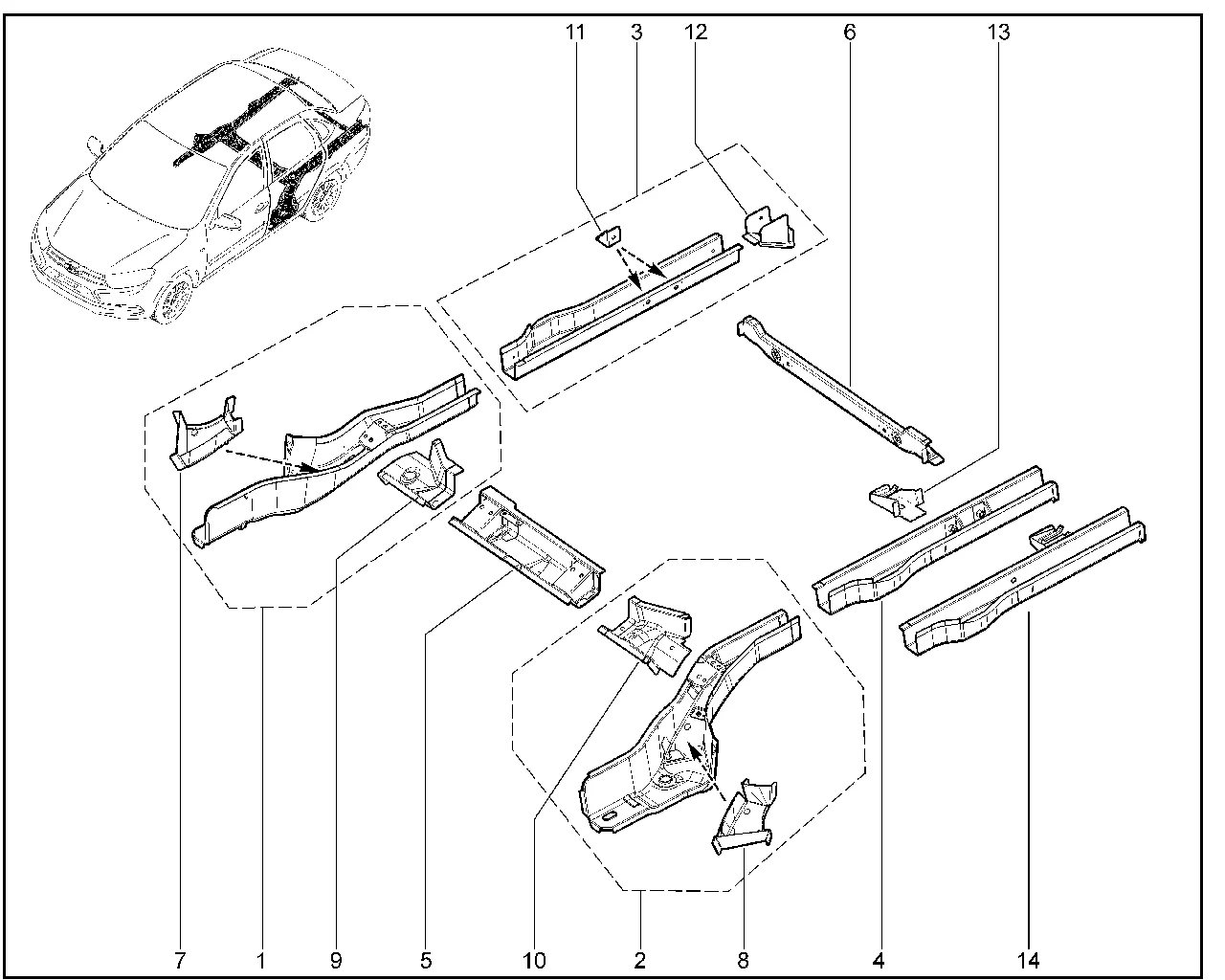| 14 | Лонжерон пола задний левый в сборе (FL) | 8460006767 |