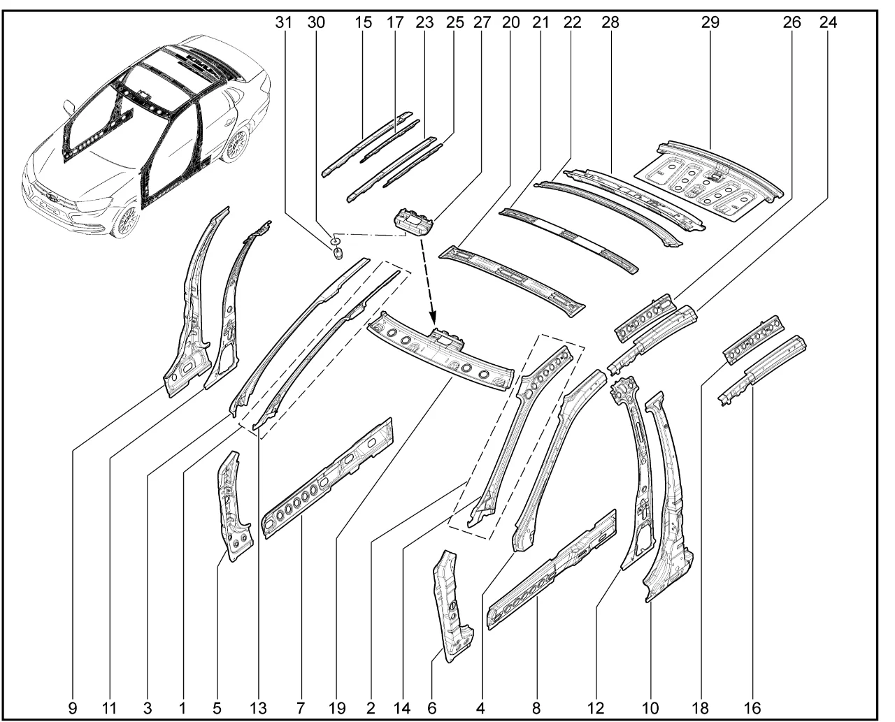 | 28 | Балка крыши задняя в сборе | 21910570112070 | 8450104327 |