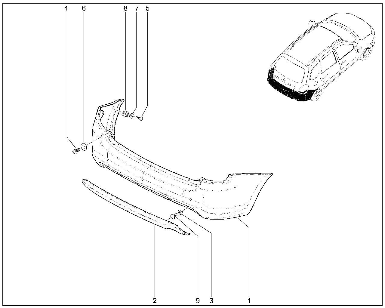 | 1 | Бампер задний без отверстий под датчики системы парковки (под окраску) | 21940280401501 | 8450005914 |