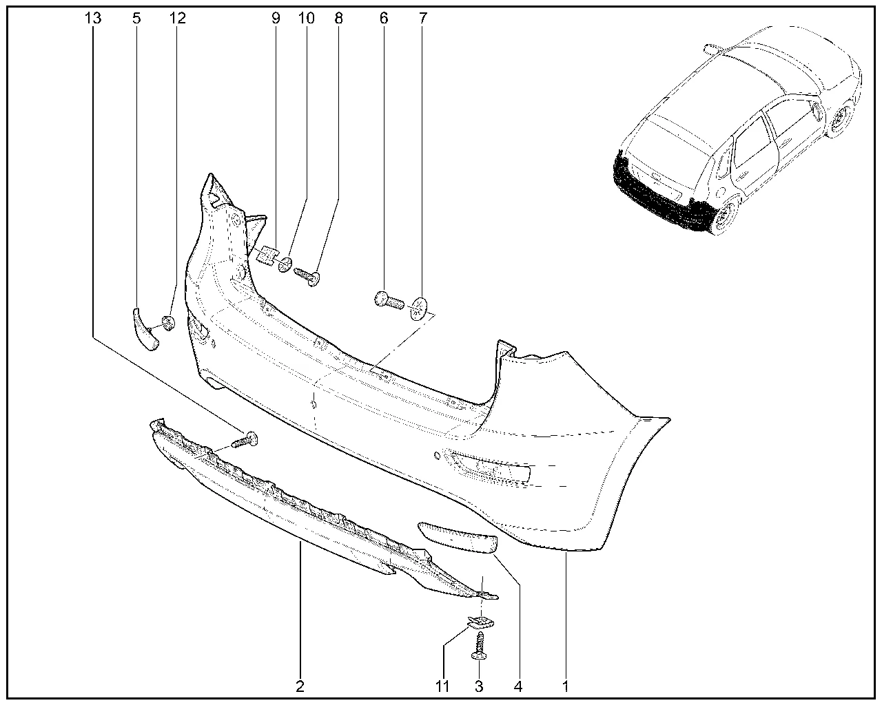 | 1 | Бампер задний без отверстий под датчики системы парковки (под окраску) | 21920280401501 | 8450005912 |