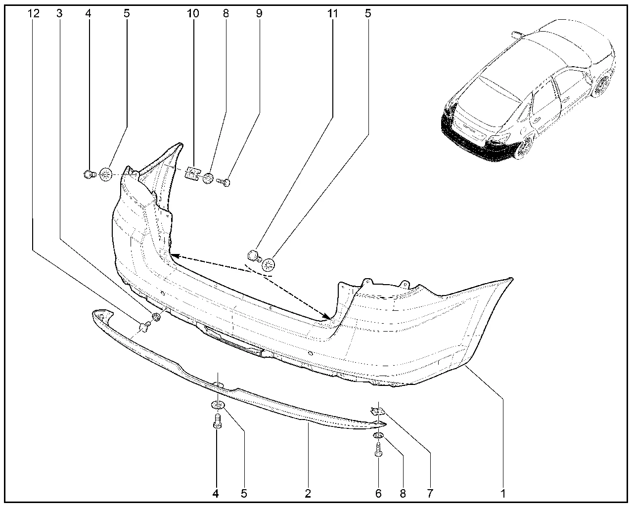 | 1 | Бампер задний без отверстий под датчики системы парковки (под окраску) | 21910280401501 | 8450003348 |