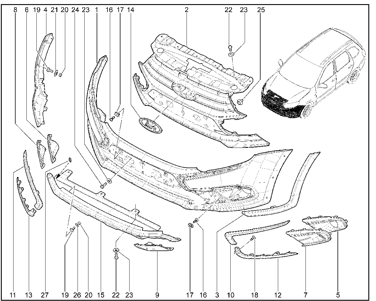 | 1 | Бампер передний с отверстиями под накладки CROSS (под окраску) | 8460018375 | |