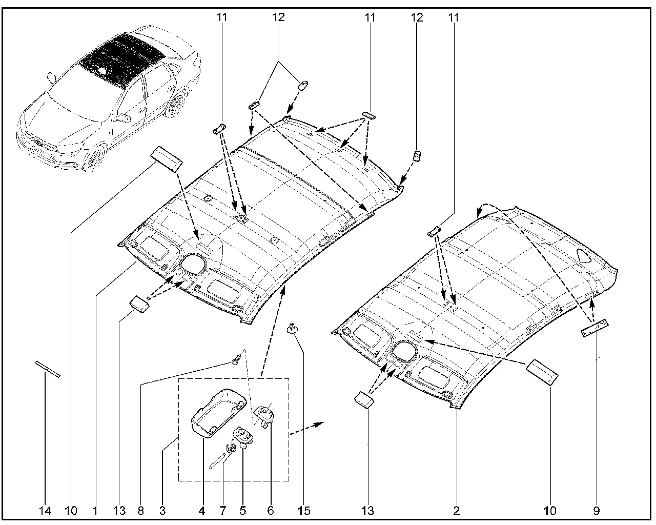 | 2 | Обивка крыши (лифтбек, без шумоизоляции, с отверстием под микрофон) | 8450109046 | |