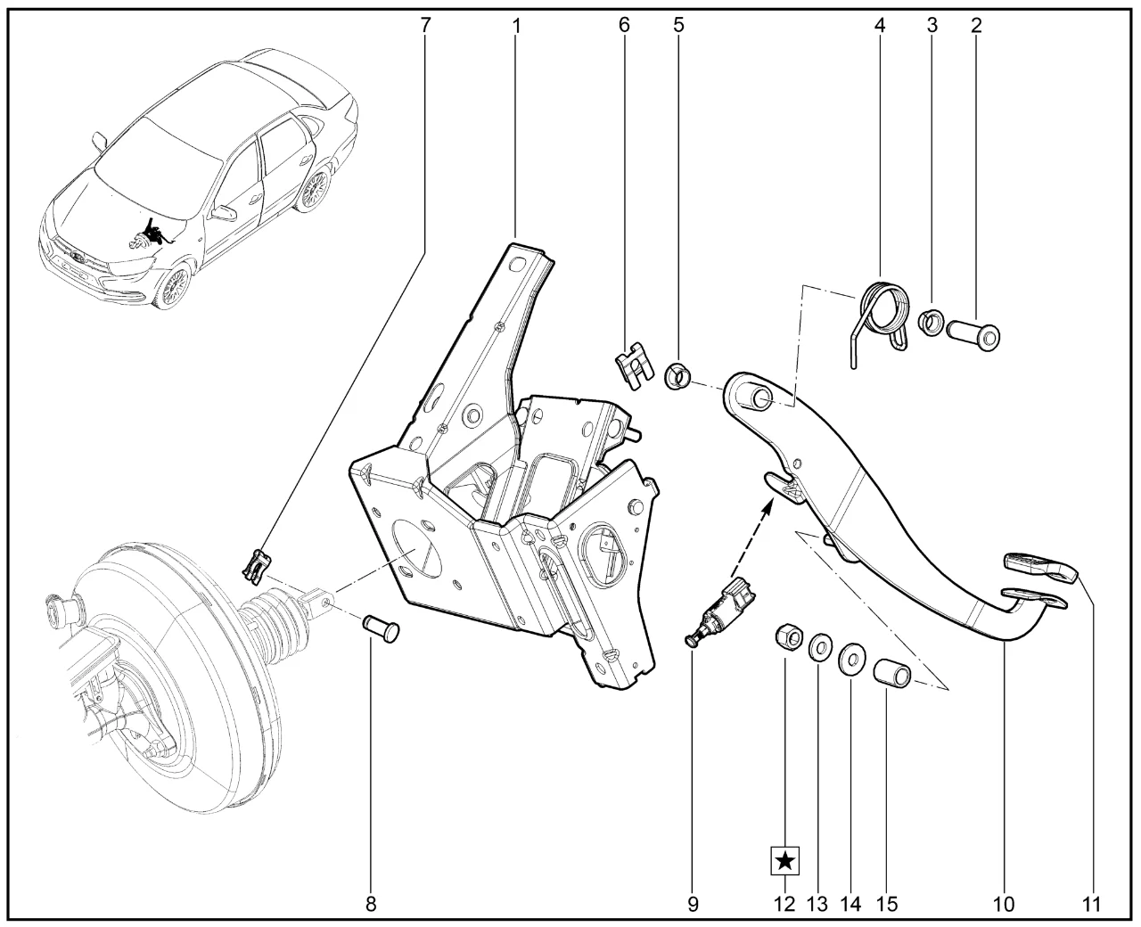| 1 | Усилитель с кронштейнами педалей сцепления и тормоза в сборе | 21901160206001 | 8450102986 |