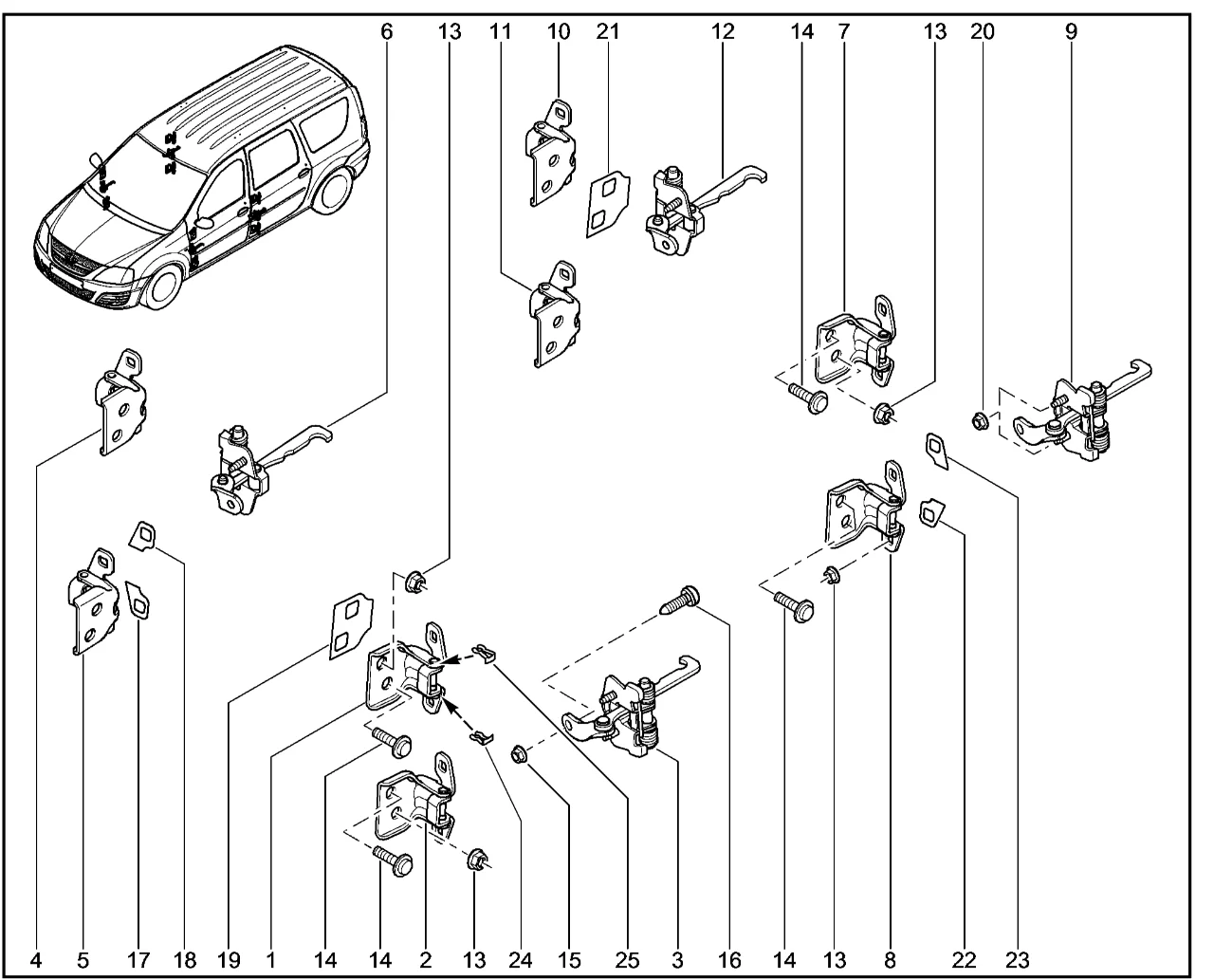 | 15 | Гайка крепления ограничителя к двери | 7703034259 | |