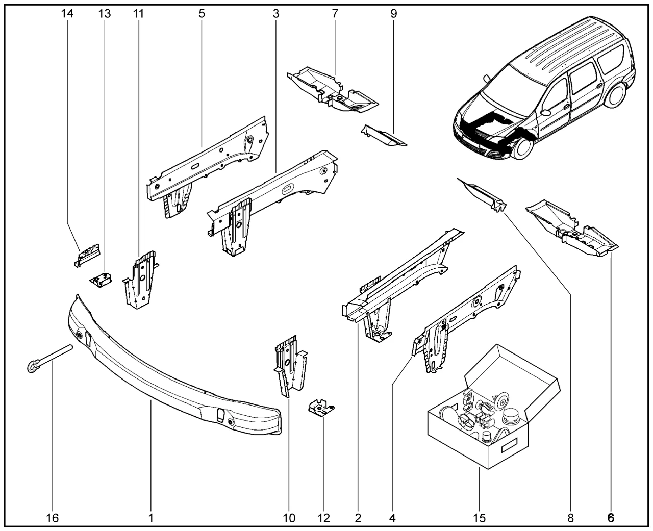 | 14 | Кронштейн буксировочного кольца передний в сборе | 6001546730 | |