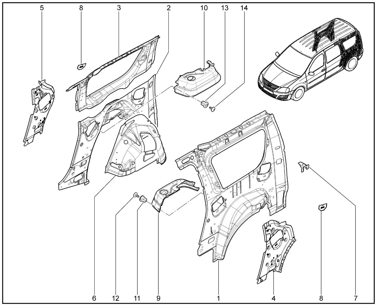 | 1 | Панель задней стойки левая (универсал) | 6001548827 | |