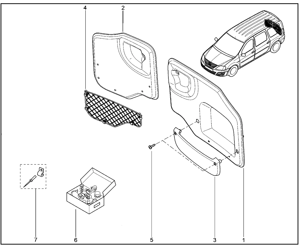 | 7 | КОМПЛЕКТ КРЕПЁЖНЫЙ СЕТКИ ХРАНЕНИЯ МЕЛКИХ ВЕЩЕЙ ПРАВОЙ ДВЕРИ ЗАДКА | 6001551455 |