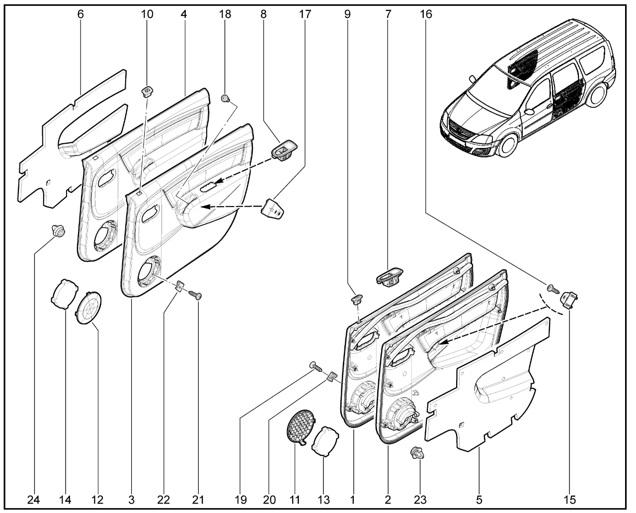 | 4 | Обивка задней двери правая с отверстием под ручку (тиснение) (механический стеклоподъёмник) | 8460013344 | |