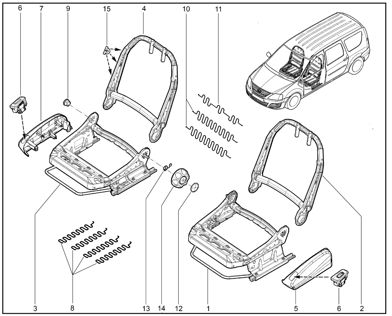 | 1 | Каркас подушки переднего левого сиденья (с салазками в сборе) | 8450105224 | |