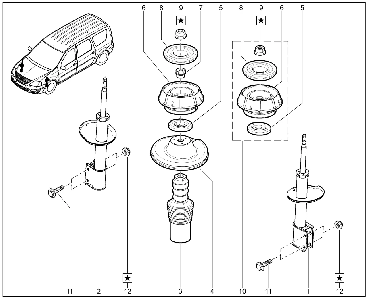 | 1 | Стойка телескопическая передней подвески (фургон) | 543027245R | |