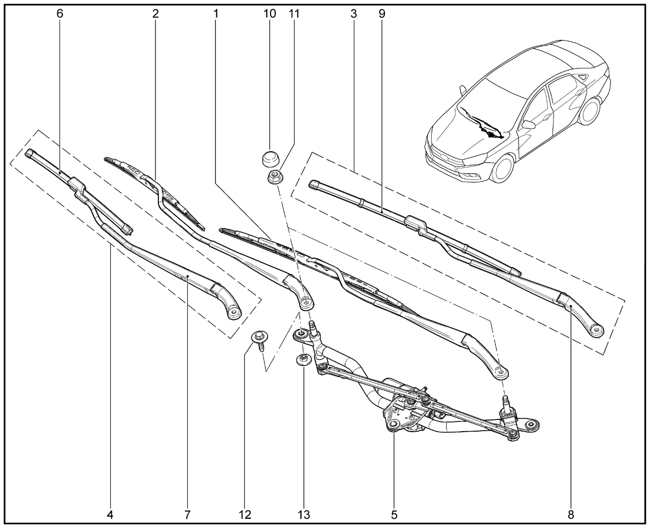 | 4 | Рычаг со щёткой стеклоочистителя со стороны пассажира в сборе (тип бескаркасный) | 8450044488 | |